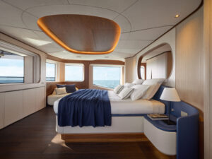 A prua si trova la suite armatoriale full beam, che si sviluppa in una raffinata zona notte con area studio privata e un ampio bagno. La posizione avanzata consente una visibilità a 270° verso l’esterno, regalando all’armatore una vista continua sull’orizzonte.