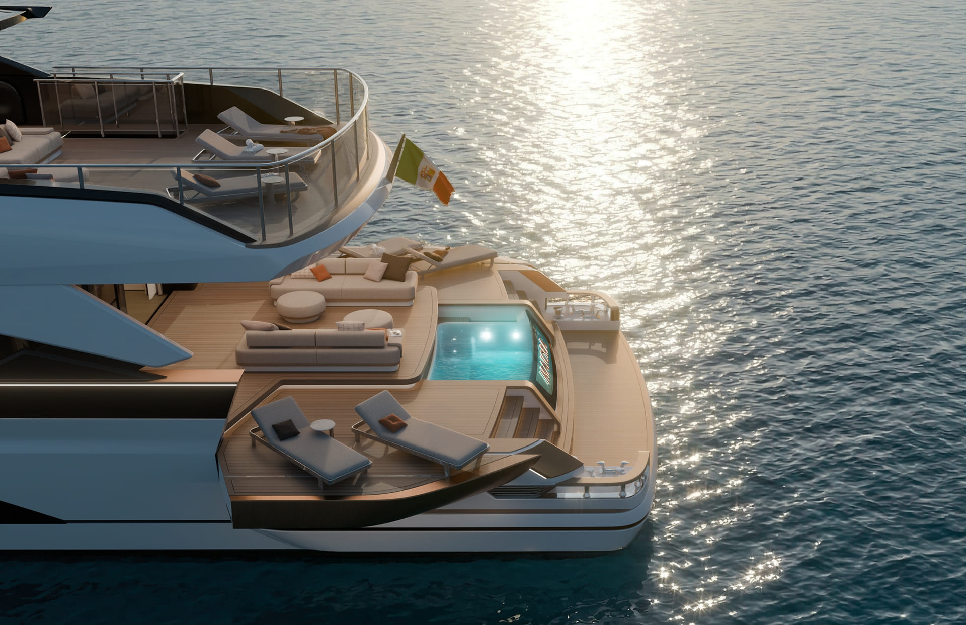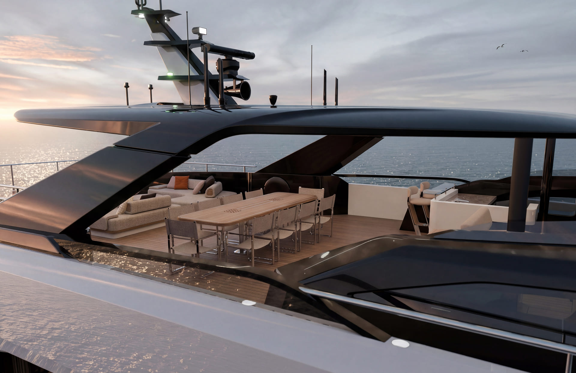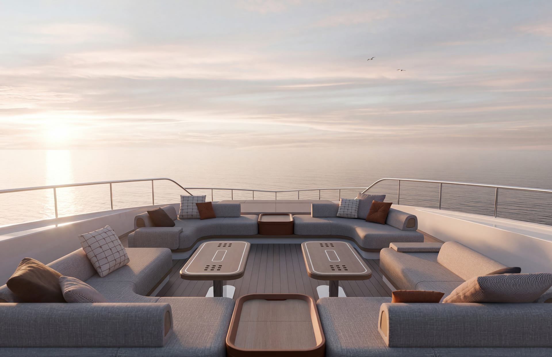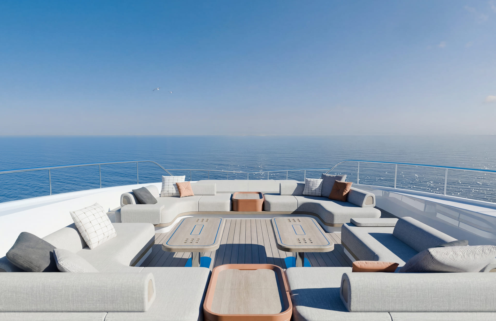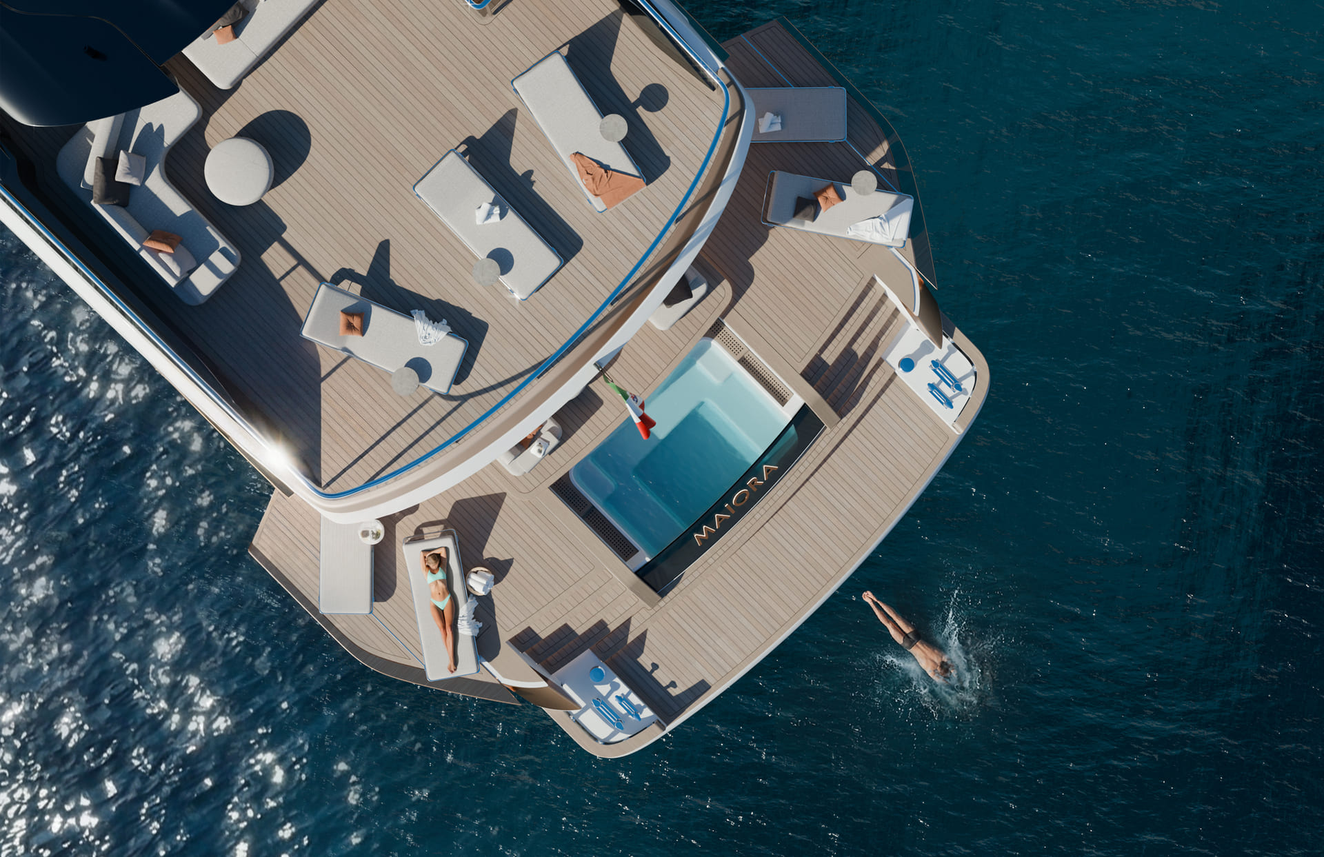 At the stern, the folding side wings open gracefully, bestowing the space with unparalleled versatility. An expansive, seamless cockpit unfolds, all on a single harmonious level. This design creates a perfect sense of continuity, as if the boundary between life on board and the sea dissolves, offering an immersive and intimate experience — a deep embrace with the waves and the endless breath of the water.